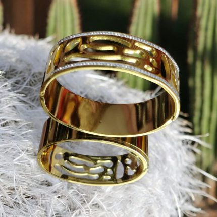 Product description Anti-tarnish stainless steel bangles with gold plating and cubic zirconia stones. Perfect for women and girls, these bracelets