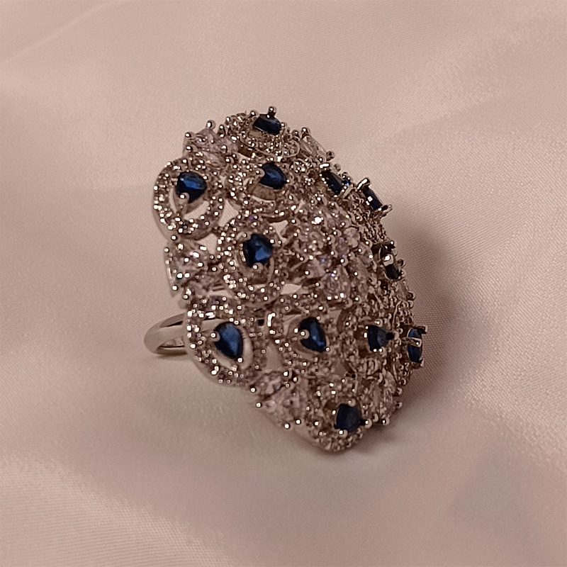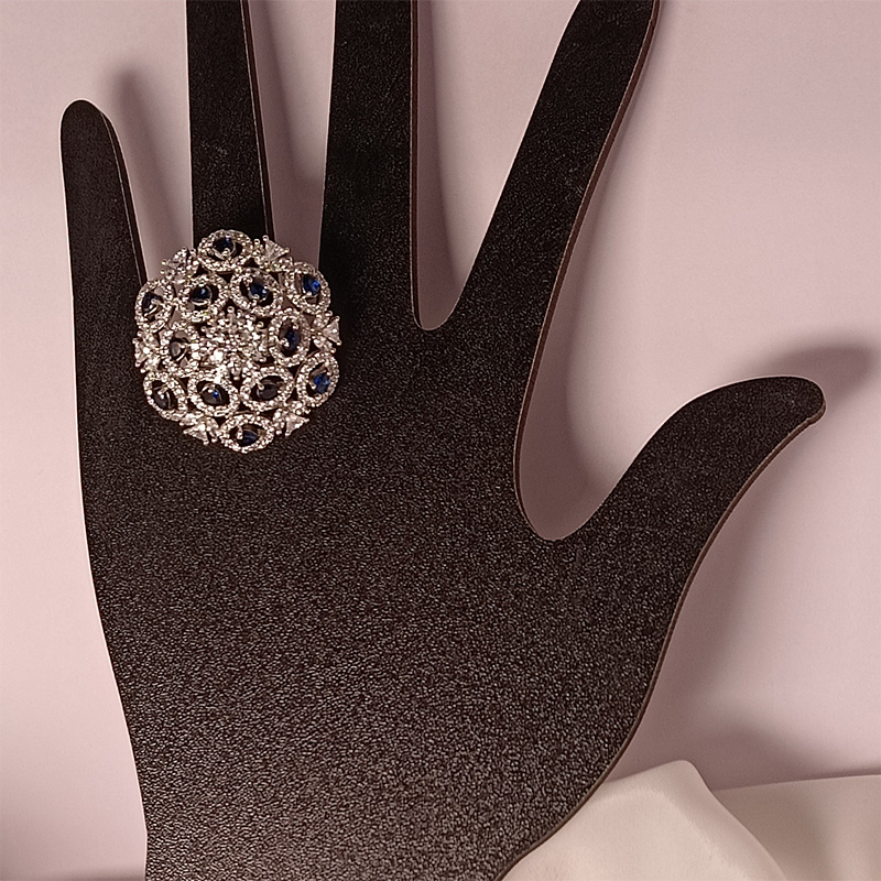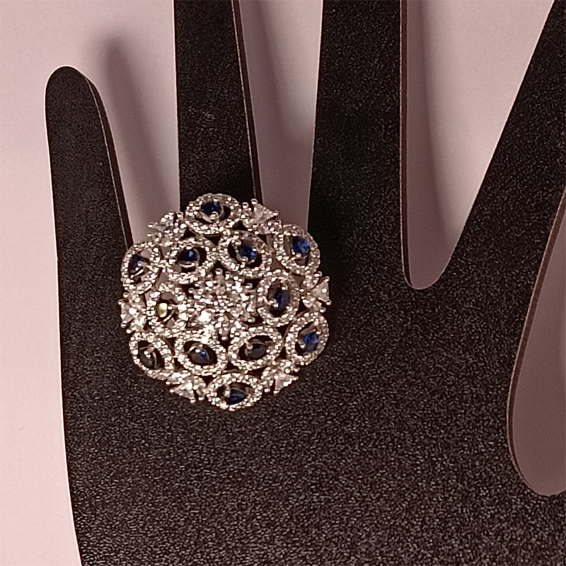 A celestial marvel in miniature, the Mahveen Sapphire Starfire Ring commands attention with its intricate constellation of deep blue sapphires surrounded by radiant white stones. Set in luminous silver, the floral-inspired arrangement evokes the allure of a night sky in bloom. The band rises into a domed crown where light dances through every gem—crafted to dazzle from every angle. Perfect for formal soirées or personal milestones, this ring channels grace, grandeur, and timeless sophistication.