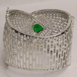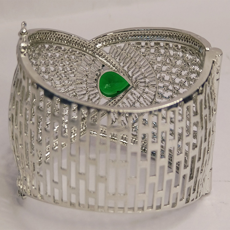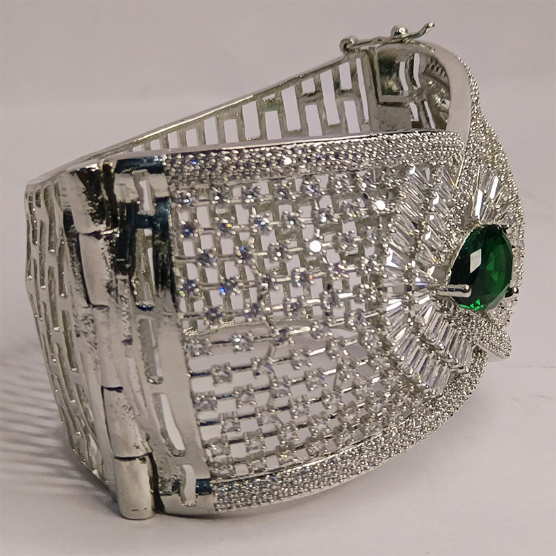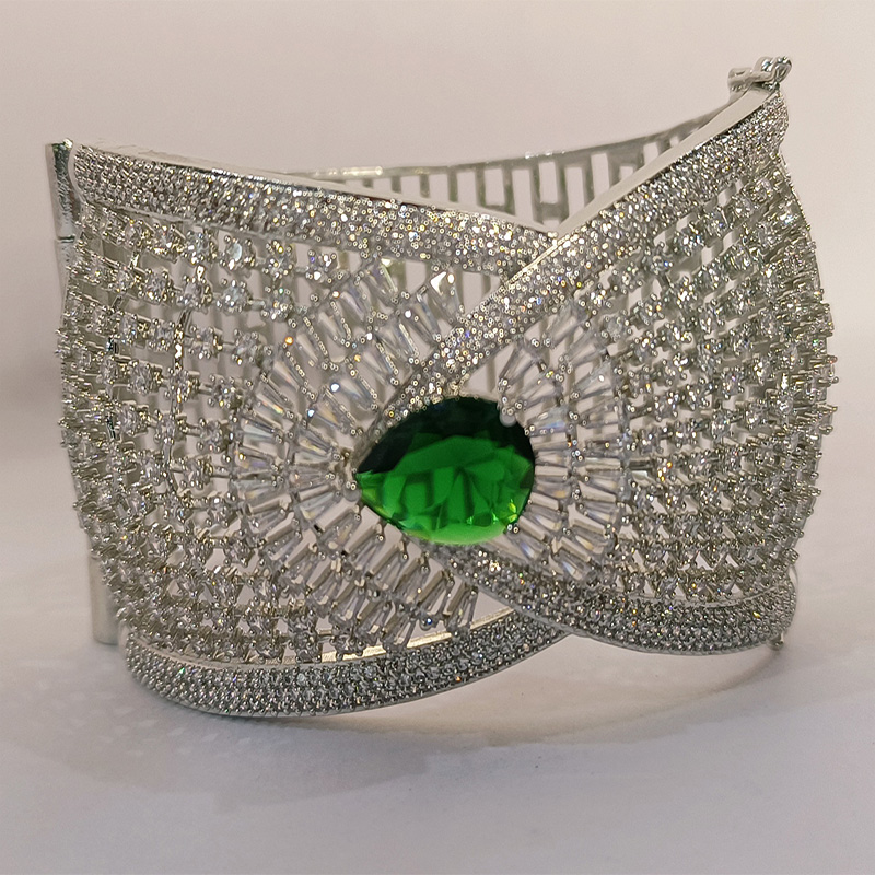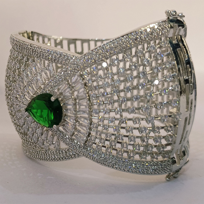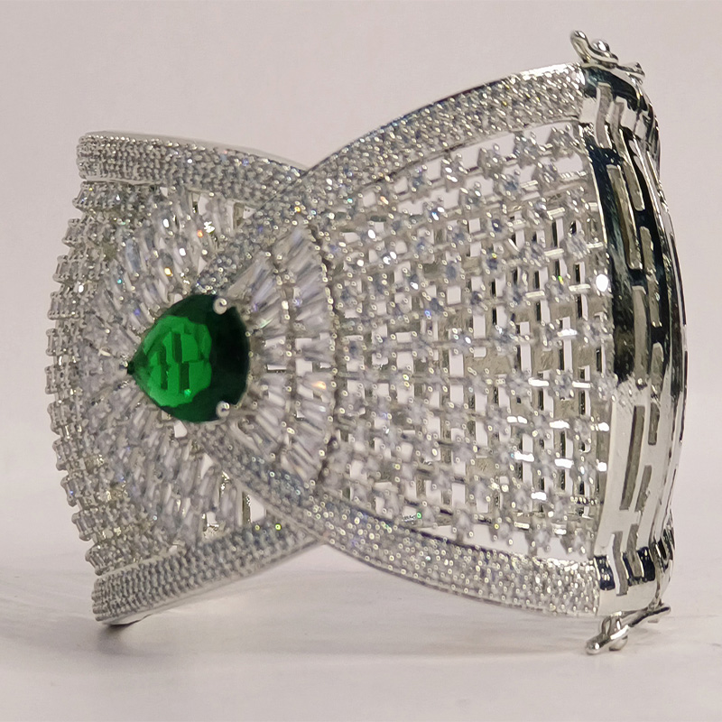 A symphony of structure and sparkle, the Feroza Radiant Crest Bracelet features an exquisite green gemstone at its heart—evoking royalty and serenity. Surrounding the emerald-hued centerpiece, baguette-cut crystals fan outward like a luminous crest, framed by a mesh of shimmering white stones and delicate silver filigree. The intricate latticework and cool-toned brilliance make it a modern classic—ideal for upscale soirées, bridal couture, or gifting moments that demand timeless elegance.