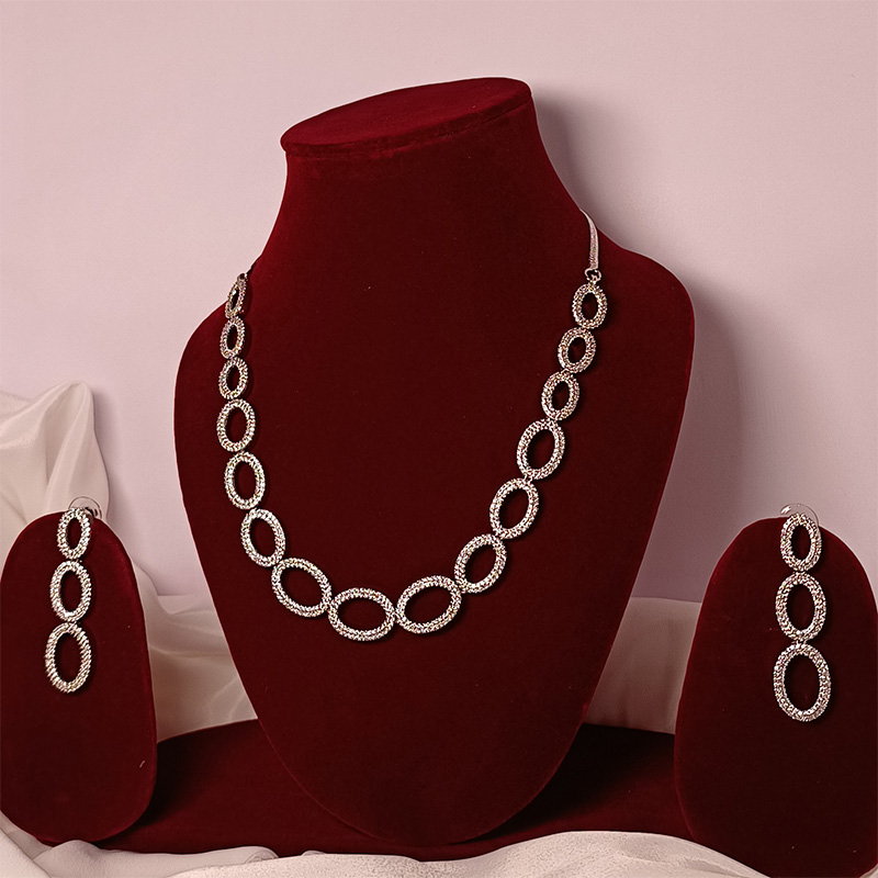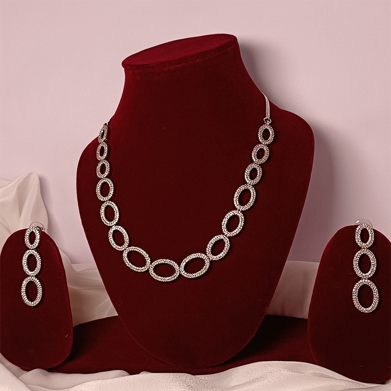 A vision of timeless elegance, the Eliza Oval Radiance Set pairs a delicate necklace with matching earrings, each adorned with brilliant oval-shaped links encrusted in shimmering white stones. The sleek design strikes a perfect balance between modern minimalism and vintage allure, making it ideal for both formal events and everyday sophistication. Whether worn as a bridal accent or a signature piece for soirées, this set is made to highlight confidence and charm with every glint of light.