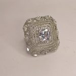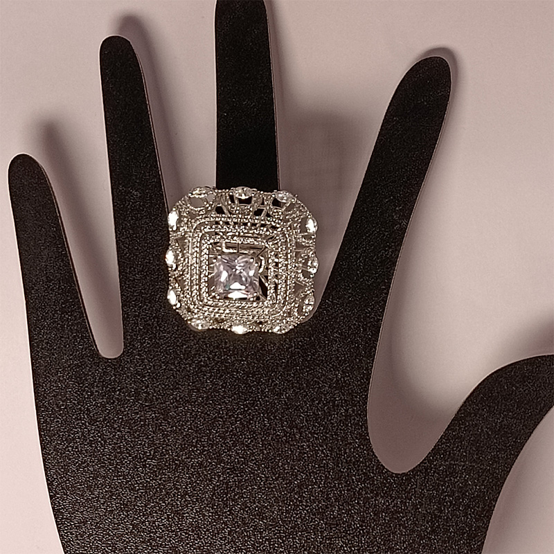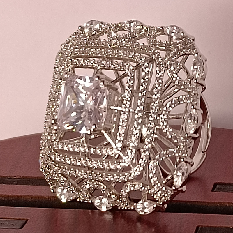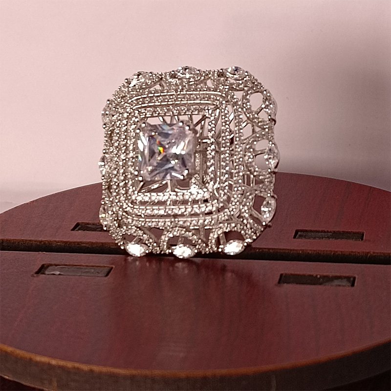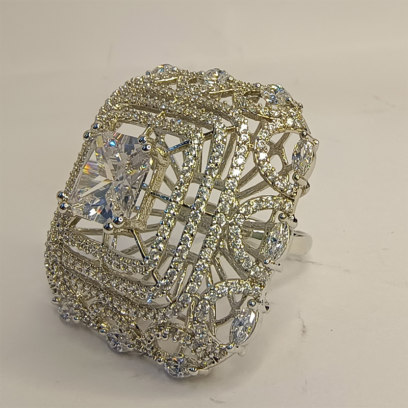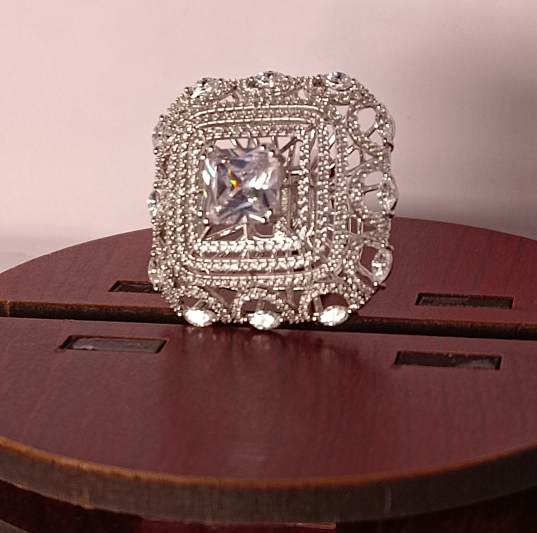 Architectural elegance meets opulence in the Zohra Regal Mosaic Dome Ring. Crowned with a grand square-cut centerpiece, this ring unfurls into a layered halo of glittering stones, forming a mesmerizing lattice of geometry and light. The outer dome is masterfully filigreed, echoing vintage arches and royal ceiling murals, with each crevice adorned in twinkling accents. Bold, luxurious, and steeped in legacy, this piece is perfect for statement-makers, collectors, and anyone who believes in the art of adornment.