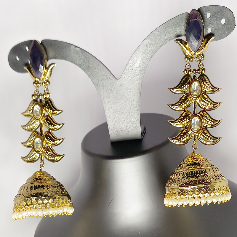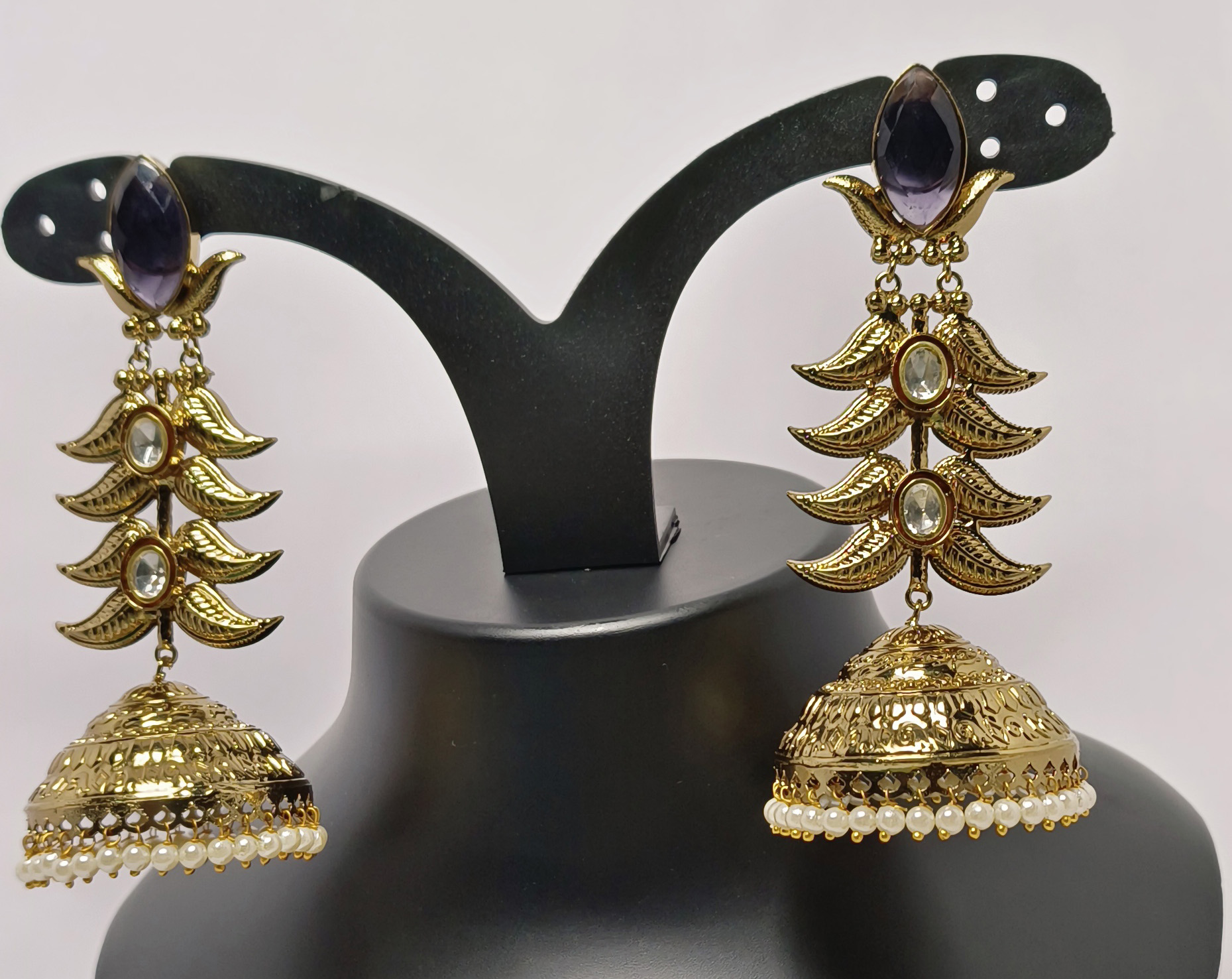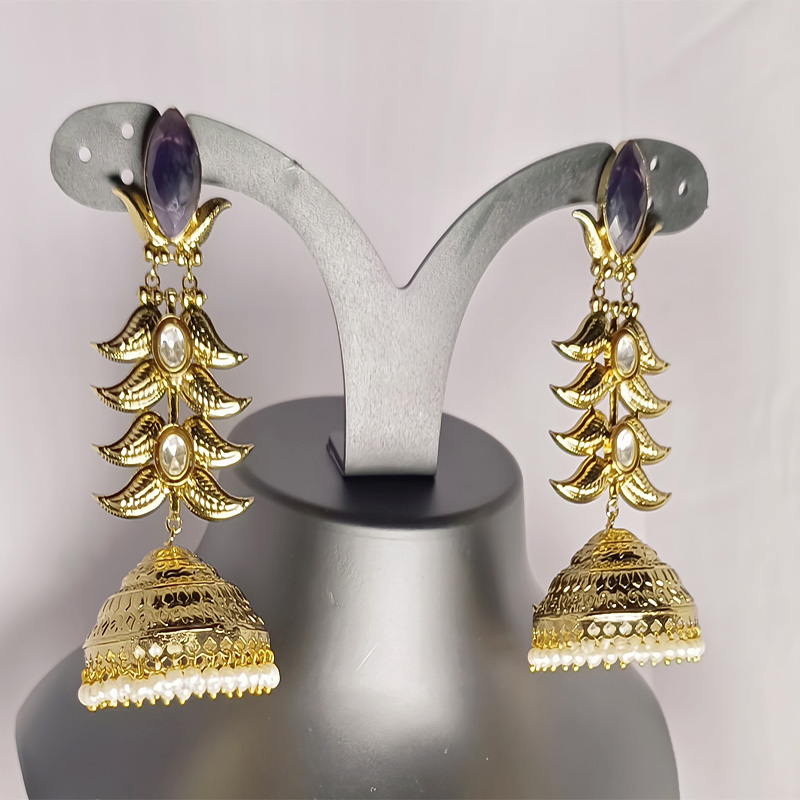 A radiant ode to heritage, the Noorani Gulbahar Jhumkas fuse Mughal nostalgia with modern finesse. Each earring begins with a regal amethyst-hued stone set in lustrous gold, descending into three intricately embossed floral tiers. Clear oval gems accentuate every layer, creating an elegant cascade that leads to the signature dome-shaped jhumka, adorned with fine engravings and a delicate fringe of luminous pearls. These earrings embody timeless beauty—perfect for pairing with lehengas, sarees, or fusion couture.